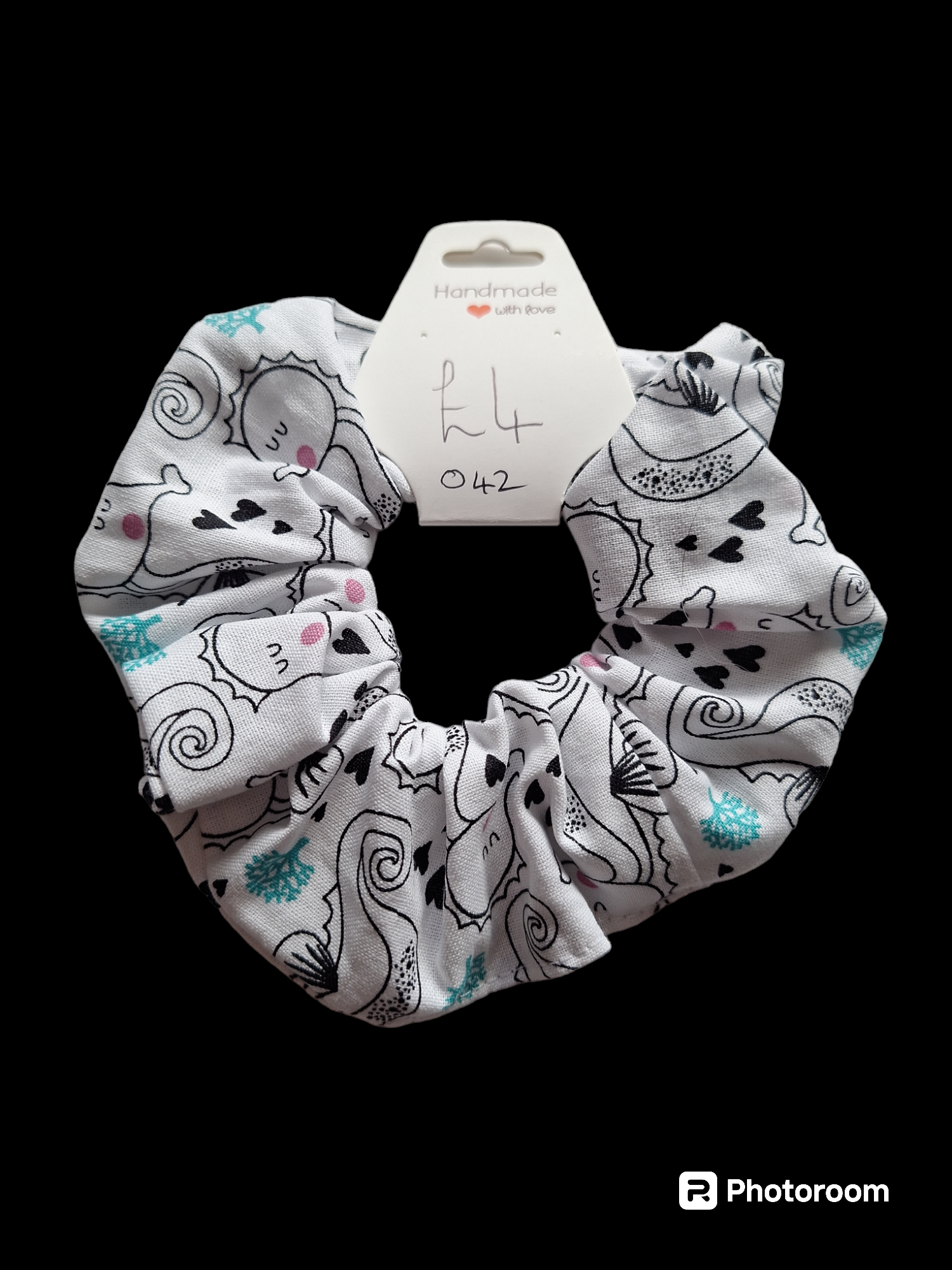 White scrunchie with seahorse pattern