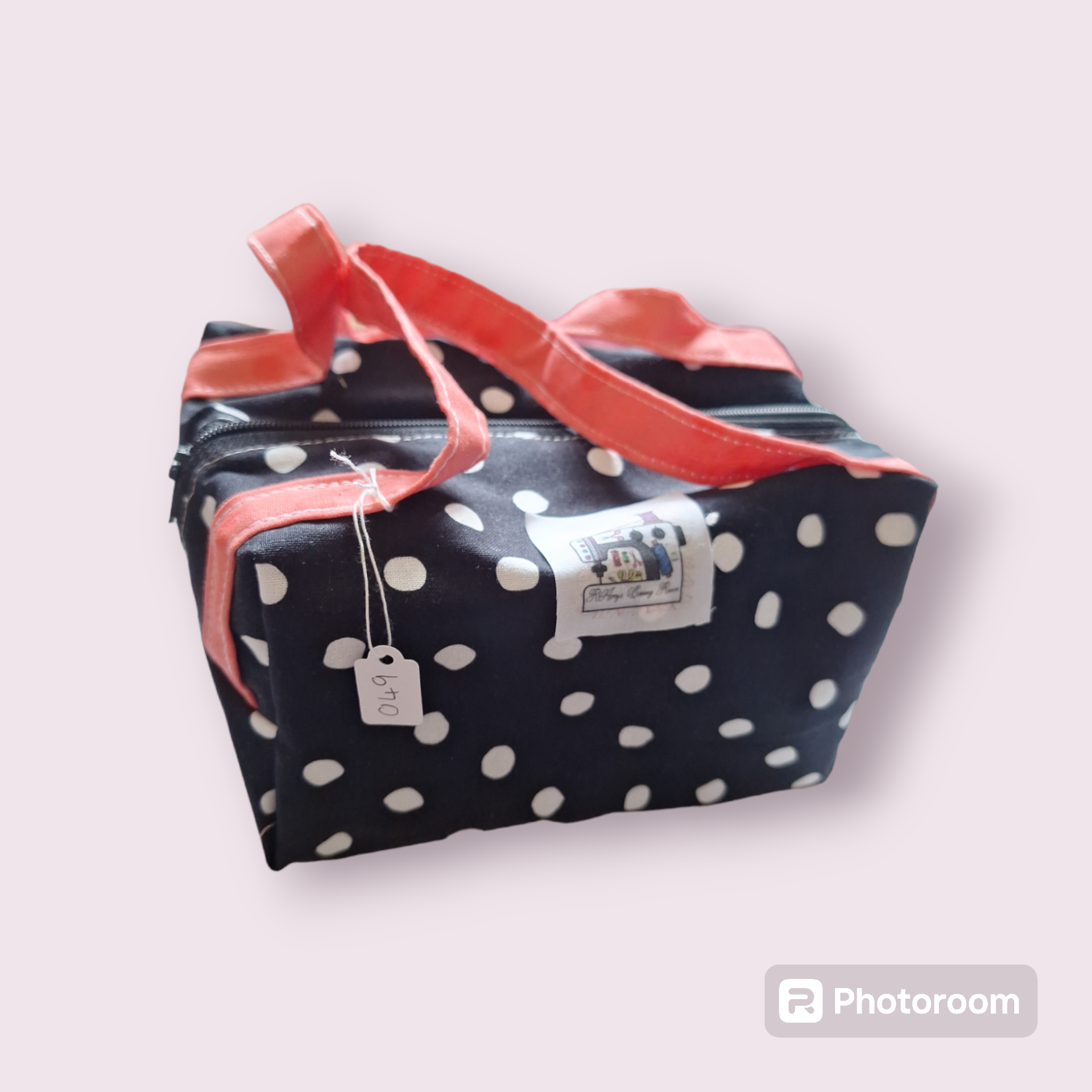 Small black with white spots, cosmetic bag.