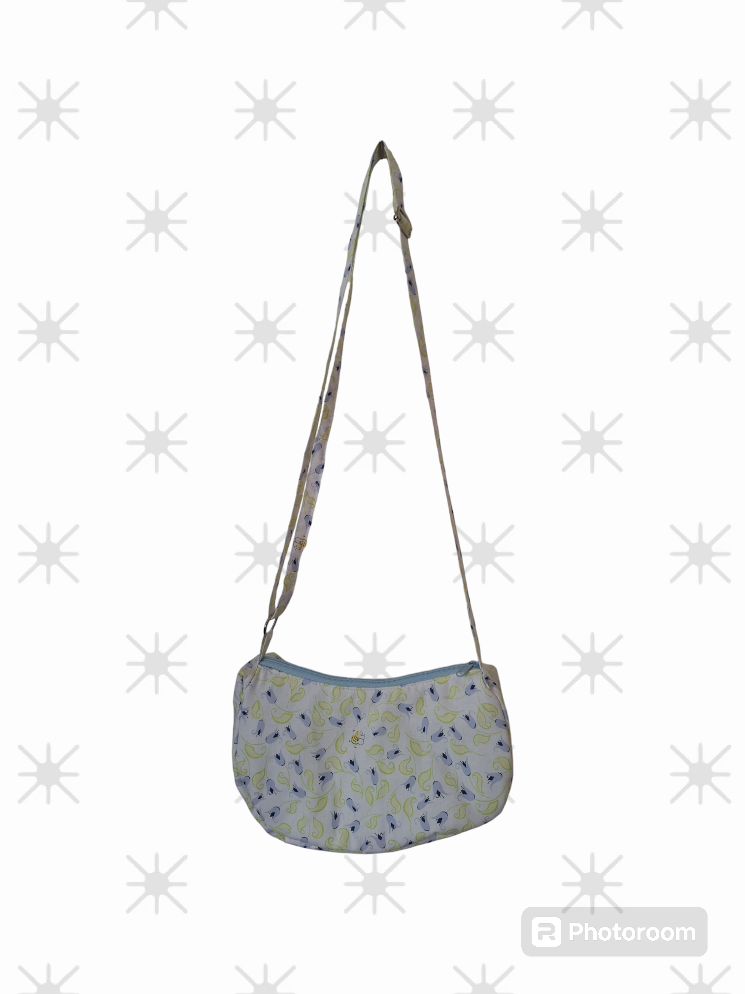 Small handbag with floral print, zip top with green patterned lining and adjustable shoulder strap