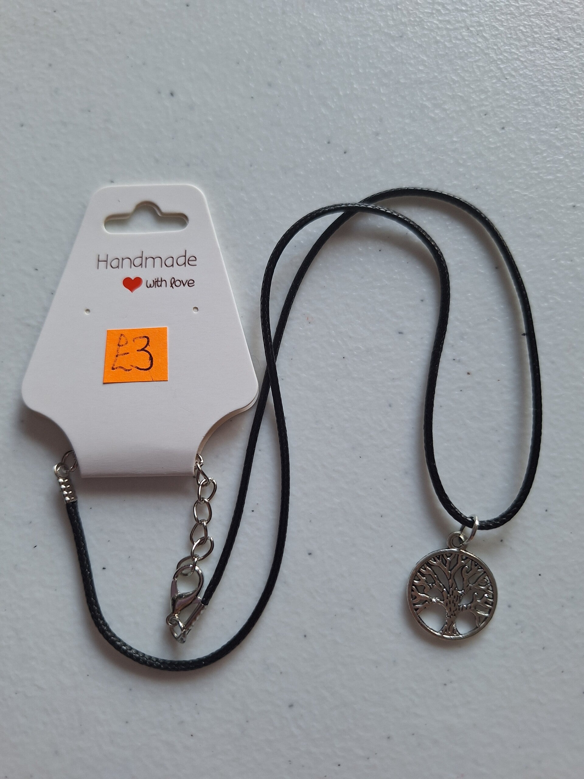 Silver-plated tree of life necklace on a black rope chain